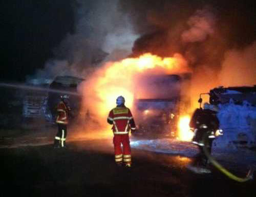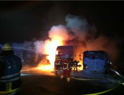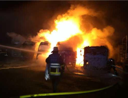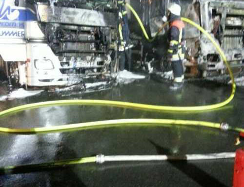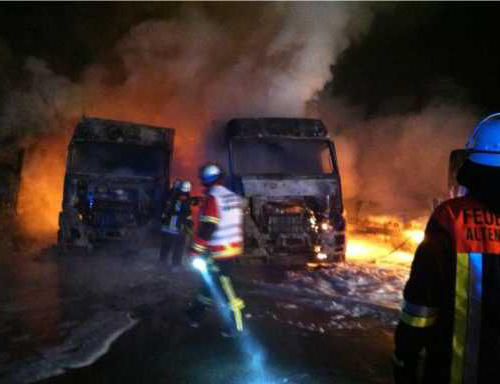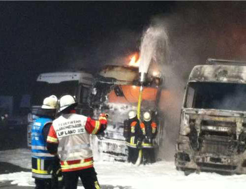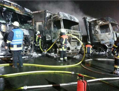 Einsatzkräfte eintrafen, brannten bereits drei Lastwagen lichterloh, die Flammen