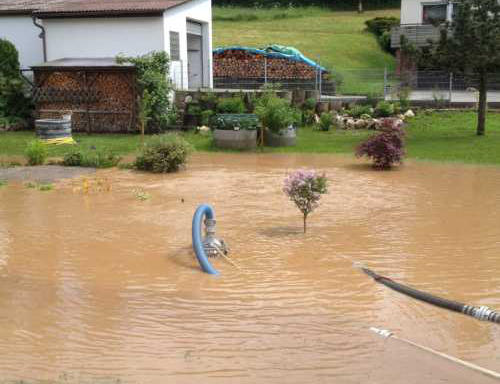 Nach Starkregen wurde der Garten des Anwesens überflutet und gefährdete