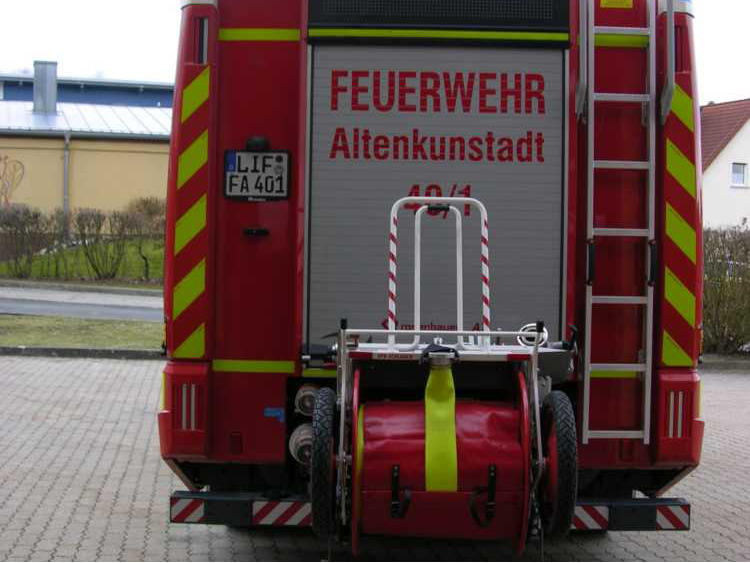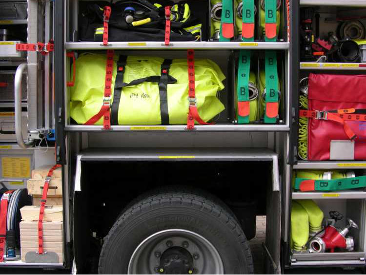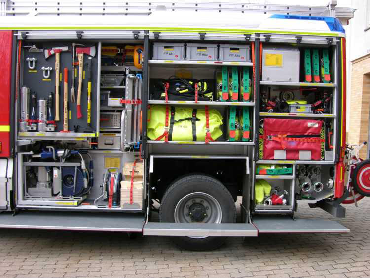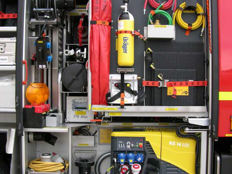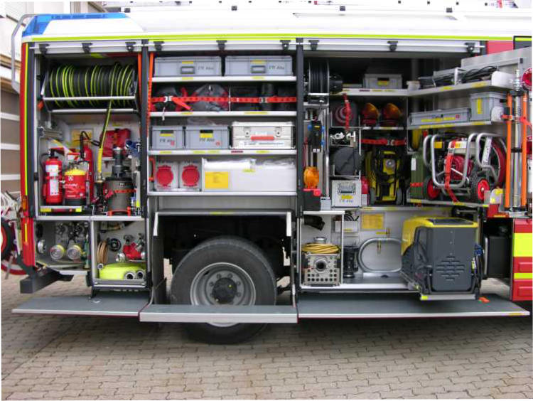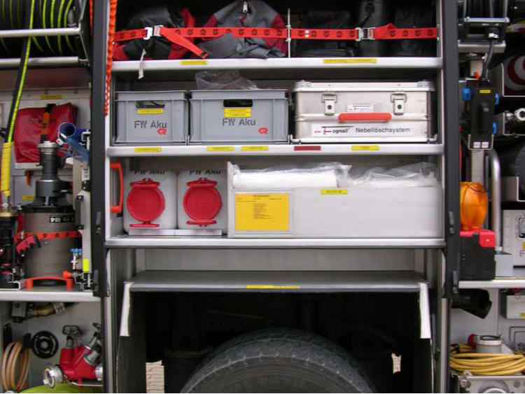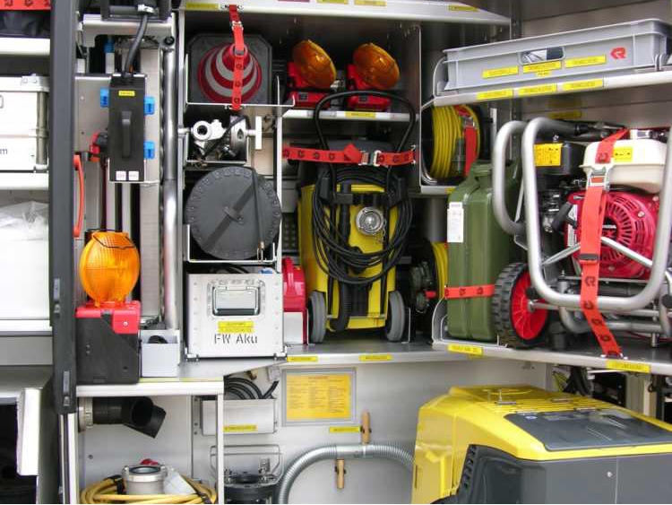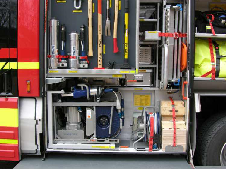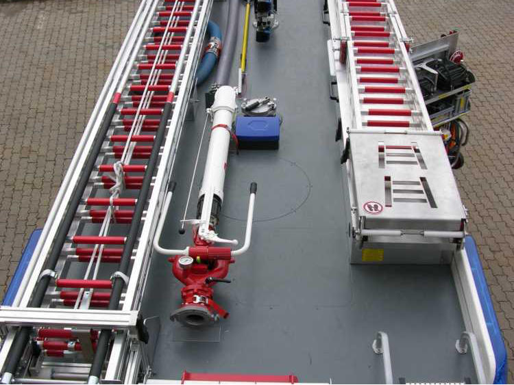 einem Ausgangsdruck von 10 bar fördern. Zu seiner umfangreichen Beladung zur Brandbekämpfung gehören auch eine vierteilige