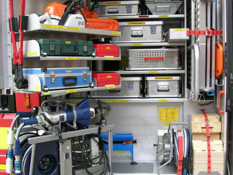 umfangreichere Beladung zur technischen Unfallhilfe, zu der unter anderem ein Mehrzweckzug, ein Trennschleifer, ein
