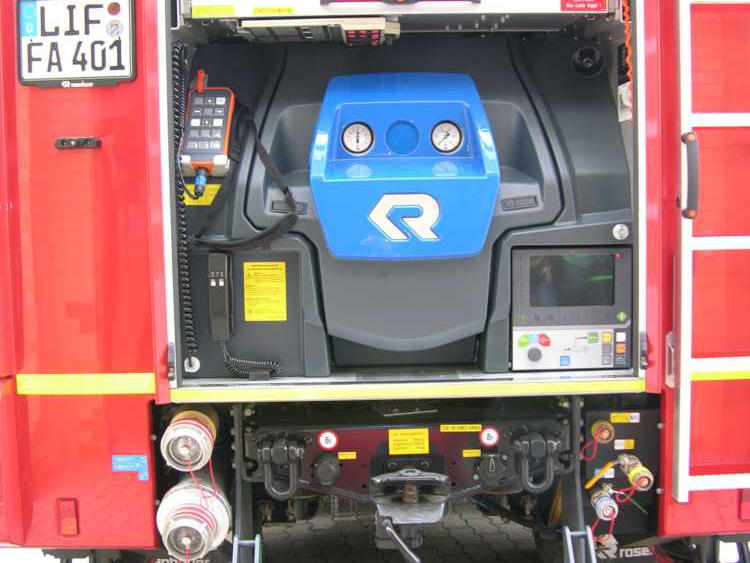 120 Liter Schaummittelvorrat und 12 kg Löschpulver. Seine Feuerlöschkreiselpumpe kann pro Minute 2.000 Liter Wasser bei