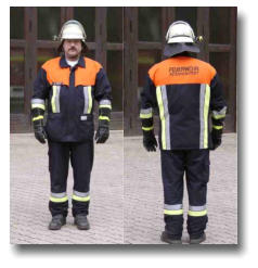 Persönliche Schutzausrüstung eines jeden FeuerwehrmannesBeim Einsatz und Übungsdienst muss gemäß der Unfallverhütungsvorschrift persönliche Schutzausrüstung getragen werden.Persönliche Schutzausrüstungen sind insbesondere deshalb erforderlich, weil im Einzelfall durch feuerwehrtechnische Maßnahmen allein die Feuerwehrangehörigen nicht ausreichen vor Unfall- oder Gesundheitsgefahren geschützt sind.
